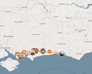 Jutro sva začela z zajtrkom v hotelski sobi. Piknik košara, ki nama jo je lastnica pripravila za zajtrk, je bila polna dobrot in kar imelo me je, da bi jo zagrabil in se odpravil zajtrkovat na plažo, toda čakal naju je nadvse pester dan. Na poti iz Brightona sva se ob cesti morala ustaviti, saj sva zagledala njihove tipične hiške ob plaži. V res čudovitem sončnem in toplem jutru (po prepihanem večeru) sva naredila nekaj fotografij teh pisanih hišk, ki jih lastniki poleti uporabljajo za shranjevanje svojih plažnih pripomočkov in kot zavetje pred soncem. Te barvite hiške so prav značilnost južne obale Anglije.
