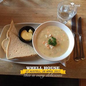Bila sva že pošteno lačna in po kratkem obhodu mesteca, ki ni trajal več kakor 10 minut, sva si naključno izbrala restavracijo Wheel House Restaurant. Našla sva prosto mizo z udobnimi klopmi, prav ob oknu s pogledom na ribiške ladje. Zadišala mi je “dalmatiska” ribiška juha. Seveda je tu niso imeli, so pa priporočili fish chowder. Brez posebnega oklevanja sva si oba naročila krožnik te posebne juhe, za nadaljevanje pa še fish&chips. Fish chowder naju je tako navdušil, da nama ga je žena kasneje doma že večkrat pripravila (https://www.bbcgoodfood.com/recipes/1898/chunky-fish-chowder).