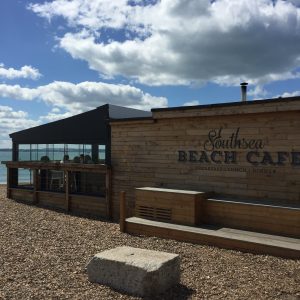 Naredil se je prelep sončen dan in kot bi vedel vnaprej, sem že med planiranjem potovanja doma naredil plan, da se ustaviva ob plaži Eastney Beach v Southsea Beach Cafe. Gre za prijeten lokalček ob plaži s pogledom na morje. Videl sem celo enega človeka plavati v tem mrzlem morju. Koliko stopinj je imelo takrat morje, raje ne vem. Iz lokalčka se je je videl tudi mestni pomol, imenovan South Parade Pier. Okrepčala sva se s pijačo in pečenim krompirčkom, vmes pa opazovala, kako se pasji sprehajalci s svojimi psmi igrajo po plaži. Kaj bi Smuk in Agor tu uživala. Agorju bi se kar zmešalo, ker bi lahko bil v vodi ves čas. Čez cesto nasproti lokala se nahaja Canoe Lake, kjer sva opazovala labode in račke, kako se igrajo na jezeru.