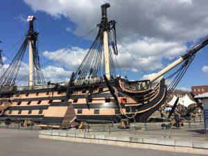 Najin naslednji stop je bil parking v bližini ladje HMS Warrior, v okolici pa tudi kar nekaj muzejev, povezanih s pomorstvom in razstavljenih nekaj zelo zanimivih ladij. HMS Warrior sva lahko videla le od zunaj, pa še to bolj slabo, saj je bilo videti, da jo obnavljajo. Pri vhodu v območje muzejev sva kar hitro ugotovila, da je tu ogromno za videti, na voljo pa sva imela le dobri dve uri. Če bi si hotela vse ogledati, bi lahko ostala kar cel dan. Zato so nama svetovali, da naj si ogledava le ladjo HMS Victory in nekaj pripadajočih muzejev. Za muzej Mary Rose Museum žal nisva imela dovolj časa. Ko sem prišel do ladje HMS Victory, sem se hitro zavedel njene veličine. Gre za kraljevo ladjo s 104 topovi, na kateri je svojo zadnjo in odločilno bitko vodil lord Nelson. Vzela sva avdio vodiča in se odpravila na ogled. Avdio vodič se je izkazal za zelo koristnega, sak naju je usmerjeno vodil po ladji in opisoval njene značilnosti, hkrati pa tudi zadnjo bitko, v kateri je umrl lord Nelson. Prav vživel sem se v tisti čas in kar malo presenečen sem bil, da je bilo manj ljudi na ladji, kot sem si predstavljal. Zanimivo je tudi videti, kje so pomorščaki spali in kako so preživljali dneve na ladji. Še jaz, ki načeloma veljam za majhnega človeka, sem imel na ladji kar precej težav z višino stropa. Ogled sva nato nadaljevala skozi tri muzeje, ki so pripadali h vstopnici. Nekaj stvari je bilo kar zanimivih. Na koncu pa sva prispela v trgovino, kjer so prodajali spominke in ostale pomorske pripomočke. Če bi bilo po ženino, vsega, kar bi tam lahko kupila, niti v kovček ne bi spravila, ampak par spominkov pa sva si vseeno privoščila, da naju bodo na Krku spominjali na najin angleški roadtrip.