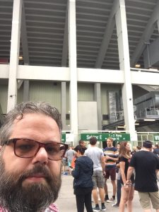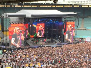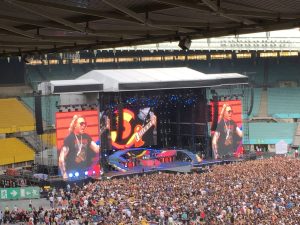 Na koncert Guns’N’Roses sem se nato odpravil kar s taksijem. Deloma tudi zato, ker se tokrat nisem nič pripravil, kako se od hotela pride do stadiona, kjer je bil koncert. Med vožnjo s taksijem sem bližino stadiona lahko ugotavljal po koncentraciji ljudi, oblečenih v majice Gunsov, na kvadratni meter. Med iskanjem pravega vhoda se je pogosto slišala tudi slovenščina. Tudi na tribuni je bilo okoli mene kar nekaj Slovencev. Tisti dan je bilo kar precej soparno in na stadionu se je počasi nabiralo vedno več ljudi.