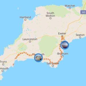 Ker sva bila na tesnem s časom, je žena predlagala, da preskočiva Plymouth Hoe in Tinside Lido, kot je bilo splanirano. Nasljednje mesto je bilo tako mesto Plymouth. To pa je pomenilo, da je bilo treba parkirati nekje drugje, kot je bilo v planu navigacije, a sva z malo lovljenja po mestu le našla parkirišče ob pristanišču, v neposredni bližini starega dela in tako sva se lahko v nekaj minutah sprehodila do Mayflower Steps in do mestnega obzidja Royal Citadel. Med ogledom mesta sva naletela tudi na varilnico Plymouth Gin, a je bila taka vrsta za vstop, da se nama ni dalalo čakati. V pristanišču je bilo veliko ladij in čolnov, turistične agencije pa organizirajo razne oglede z čolni. Bila sva že lačna, a nisva našla nobene pametne restavracije, zato sva se raje odpravila naprej proti Restormel Castle.