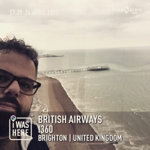 Ko sva končala z ogledom kraljeve palače, je zunaj začelo precej pihati. Nase sva navlekla vse, kar sva imela v nahrbtniku, pa še vedno naju je prepihalo. Odpravila sva se peš do razglednega stolpa British Airways i360. Zdelo se mi je, da zelo dolgo hodiva, saj je veter pihal direkt v naju in ni bilo luštno hoditi proti vetru, hkrati pa biti ves premražen. Imela sva srečo, da sva ujela zanjo uradno vožnjo (17:30), saj je bila naslednja vožnja rezervirana za neko skupino. Tino je bilo strah, ker je vedela, da se bova dvignila na višino 138 m. Ko pa sva vstopila v notranjost steklene kupole British Airways i360, jo je strah minil. Kupola se je počasi dvigala in omogočala čudovit pogled na Brighton in okolico. Videti se je dalo celo klife sedmih sester (Seven Sisters Cliffs). Škoda le, da je bilo nebo oblačno, saj bi bil verjetno ob sončnem vremenu razgled še bolj veličasten. Na eni strani celo mesto Brighton, na drugi strani pa širno morje.